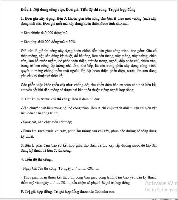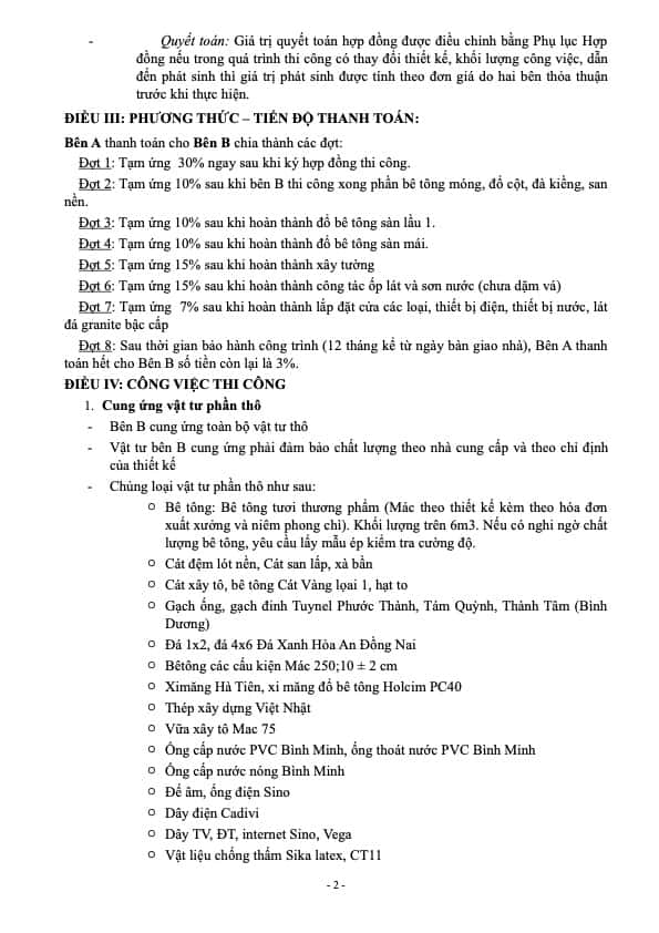 Tiến độ xây dựng được tạo thành các giai đoạn sau:- giai đoạn 1: [Mô tả công việc và thời gian]- quy trình tiến độ 2: [Mô tả quá trình và thời gian]- giai đoạn 3: [Mô tả công việc và thời gian]Điều 3. Giá trị hợp đồng và cách thức thanh toán3.1. Tổng mức vốn hợp đồng: [Số tiền]3.2. Cách thức thanh toán:- Đợt 1: [Số tiền] sau khi ký vừa lòng đồng.- Đợt 2: [Số tiền] sau khi ngừng giai đoạn 1.- Đợt 3: [Số tiền] sau khi chấm dứt giai đoạn 2.